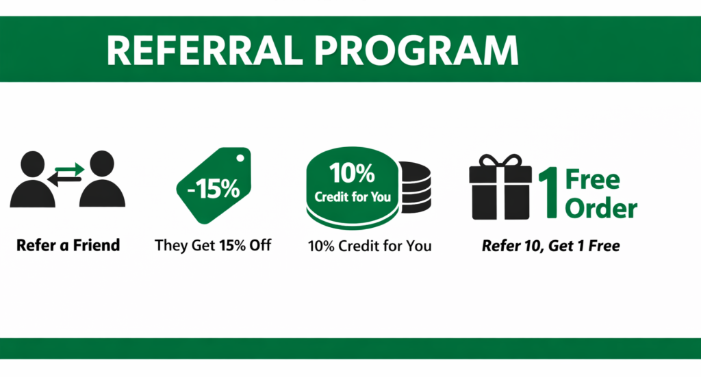 Example: Refer 10 clients, and you can earn enough credit to cover an entire custom order—essentially getting it free.